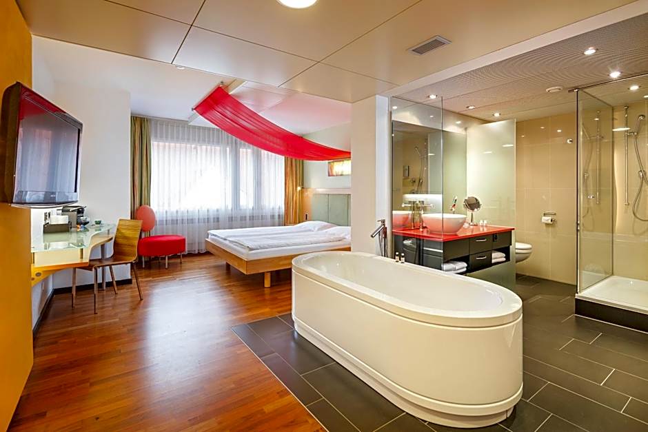 Designed in cheerful colors, this room is equipped with an open bath with a shower and a bathtub, a flat-screen TV, a hi-fi system, a direct dial telephone, a safety deposit box, a mini-bar and a Nespresso coffee machine. One free mini-bar filling per stay and room is included.